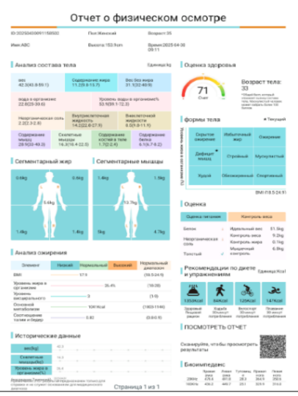 и избыточную массу тела, оценить физическое развитие и двигательную активность, рациональность питания, провести предварительную диагностику метаболизма, выявить нарушения водного баланса организма, оценить риски хронических заболеваний.